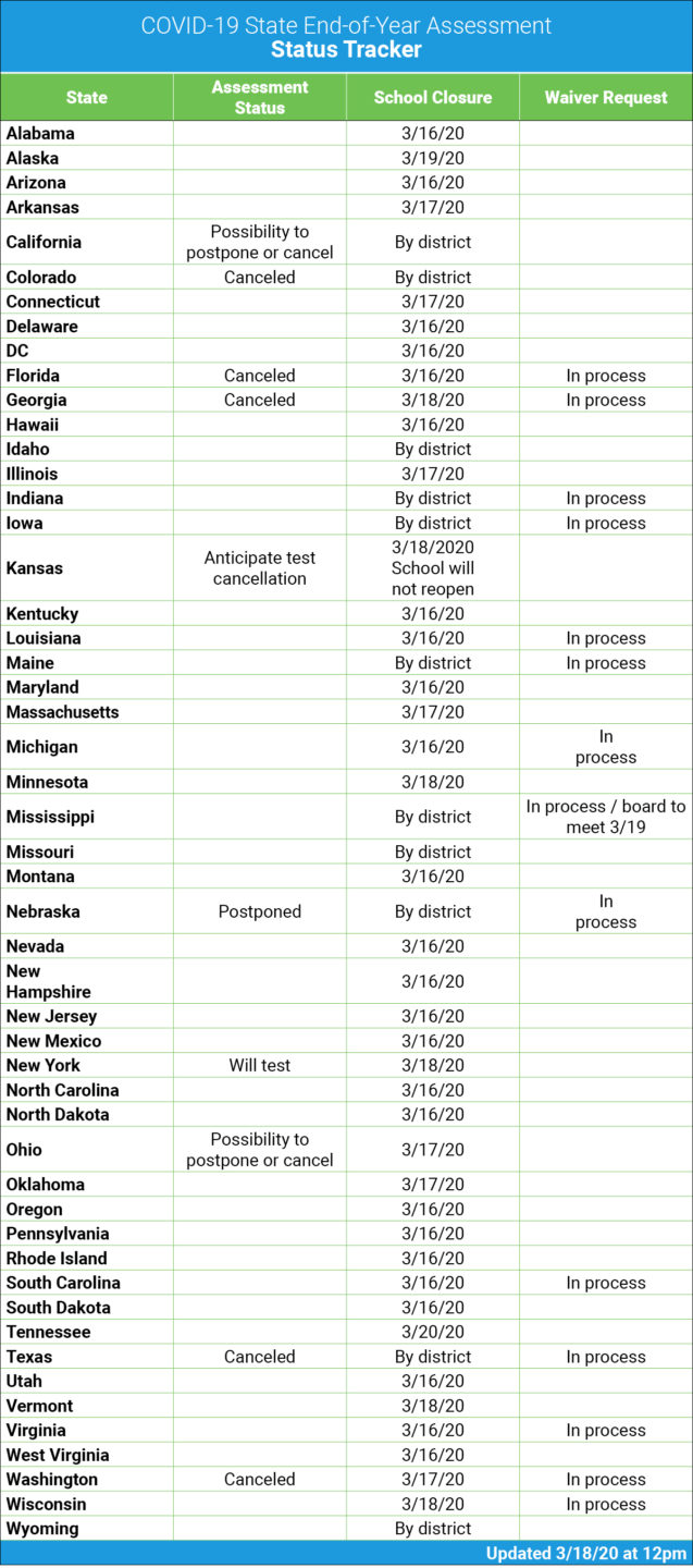 At the risk of being trite, all of this remains very fluid. Kansas just announced the closure of all schools in the state for the rest of the school year. It surely will not be the only state to do so. In the meantime, here’s a list of states and what their status is on spring testing. We will keep updating it, so please stay tuned.