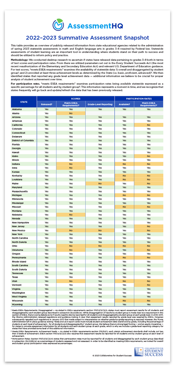 This snapshot provides an overview of publicly released information from state educational agencies related to the administration of spring 2023 statewide assessments in math and English language arts in grades 3–8 required by Federal law. Statewide assessments of student learning are an important tool in understanding where students stand on their path to success and should be utilized to inform policy and practice.